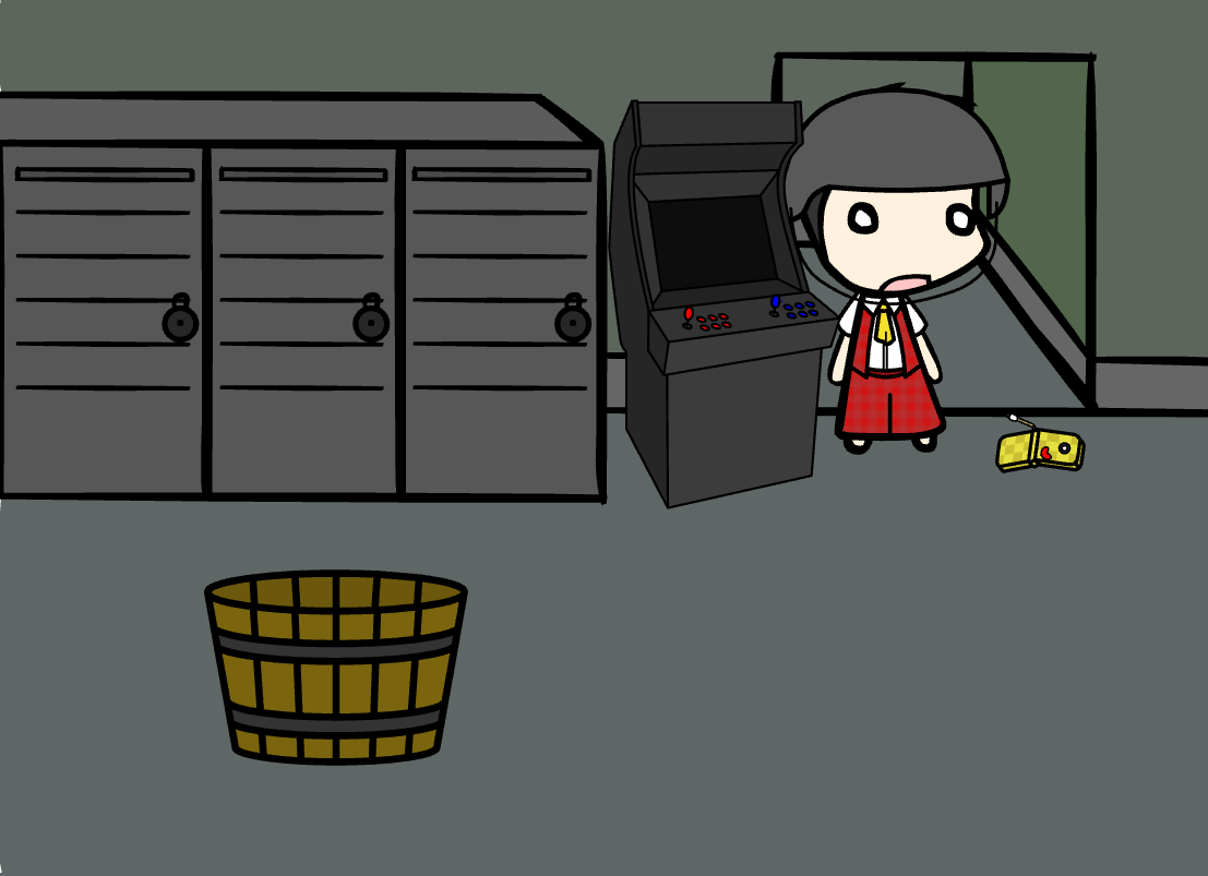 You then arrived in what appears to be a disused locker room, with an arcade cabinet, a wooden bucket, and a yellow device besides you.
