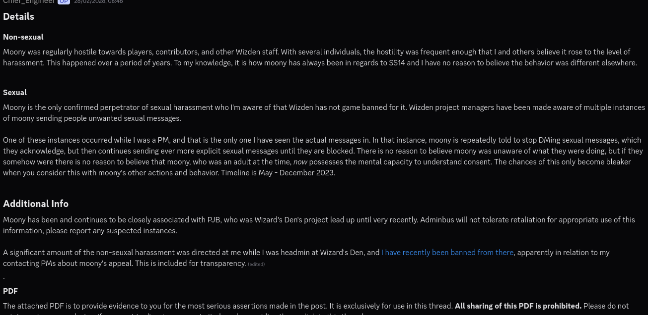 That deleted r/ss14 post was made after all of this and it looks like Kaylie/Moony is still unbanned, Chief-Engineer is still banned.