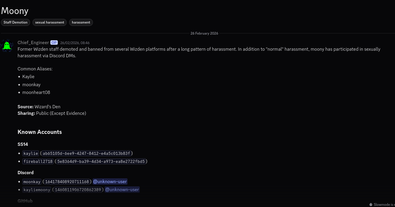 I can’t find much from Wizard’s Den about either ban even though they made an announcement to increase staff accountability and transparency and reduce toxicity after Chief-Engineer and a bunch of other staff quit over a year ago. I only find vague stuff about the Kaylie/Moony ban and nothing about the Chief-Engineer ban.